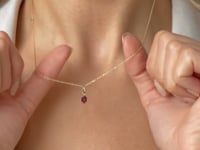 Sparkle je přívěsek vyrobený ze žlutého zlata 14k, nesoucí fasetovaný rhodolit o rozměrech 6 mm x 4 mm. Tento hluboce červený drahokam je elegantně zasazen do jemného rámu s bezpečným úchytem, podtrhující klasickou rafinovanost a eleganci.