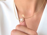 Lucy este un colier din argint placat cu aur galben, cu un design modern și elegant. Pandantivul său hexagonal este decorat cu o piatră centrală de opal, înconjurată de diamante mici, toate montate cu precizie pentru a oferi un finisaj de înaltă calitate.