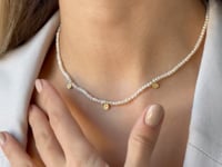 Venus este un colier din argint 925, ce îmbină eleganța clasică cu un design rafinat. Fabricat cu grijă, acest colier prezintă un șir unic de perle mici, rotunde, completat de trei pandantive metalice subtile, care adaugă un plus de sofisticare.